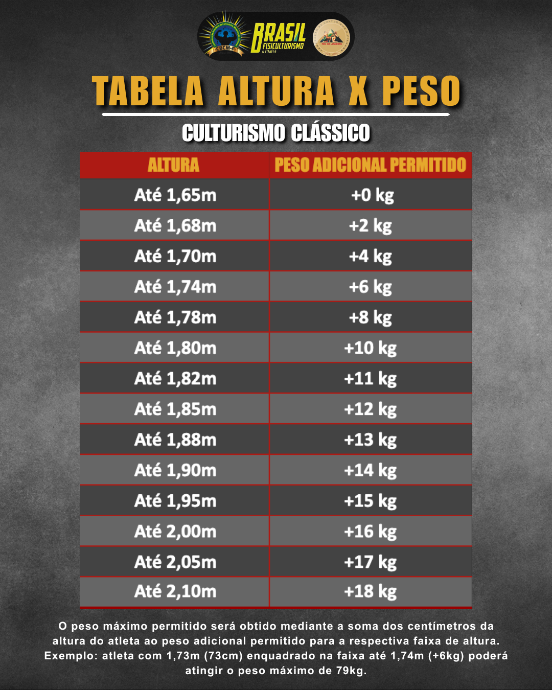 IMPORTANTE: Todos os atletas, SEM EXCEÇÃO, devem se enquadrar na faixa de peso por altura mostrada na tabela acima, mesmo que participem de uma categoria unificada.
